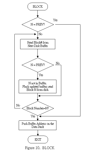 In a computer system, the core memory or the semiconductor memory is a limited and the most expensive resource which users wished to be infinite. Since it is physically impossible to have infinite amount of memory inside a computer, the next best thing is the magnetic disk memory using hard disks or floppy diskettes. Because the characteristics of the disk memory is very much different from those of the core memory, the use of disk memory often requires some device handlers to transfer data or programs between the computer and the disk. In most mainframe computers, disks and other peripherals are treated as files managed by the operating system, which insulates the users from the devices. The usage of the disk memory in high level language thus needs a fair amount of software overhead in terms of memory space and execution speed. Forth treats the disk as a direct extension of the core memory in blocks of B/BUF bytes. A user can read from these blocks and write to them much the same as he is reading or writing the core memory. Thus the disk memory becomes a virtual memory of the computer. The user can use it freely without the burdens of addressing the disk and managing the I/O. Implementing this virtual memory concept in the Forth system makes available the entire disk to the user, giving him essentially unlimited memory space to solve his problem. Disk memory in Forth is organized into blocks of B/BUF bytes. The blocks are numbered sequentially from 0 to the disk capacity. Forth system maintains an area in high memory as disk buffers. Data from the disk are read into the buffers, and the data in buffers can be written back to disk. As implemented in the figForth model, each disk buffer is 132 bytes long, corresponding to 128 byte/sector in disk with 4 bytes of buffer information. The length of buffer can be changed by modifying the constant B/BUF which is the number of bytes the disk spits out each time it is accessed, usually one sector. B/BUF must be a power of 2 (64, 128, 256, 512, or 1024). The constant B/SCR contains the value of the number of blocks per screen which is used in editing texts from disk. B/SCR is equal to 1024 divided by B/BUF. Disk buffers in memory are schematically shown in Fig. 9, assuming that each buffer is 132 bytes long. Several other user variables are used to maintain the disk buffers. FIRST and LIMIT define the lower and upper bounds of the buffer area. LIMIT - FIRST must be multiples of B/BUF + 4 bytes. The variable PREV points to the address of the buffer which was most recently referenced, and the variable USE points to the least referenced buffer, which will be used to receive a new sector of data from disk if requested. The most important and the most used word to transfer data into and out of the disk is BLOCK. BLOCK calls another word BUFFER to look for an available buffer. BUFFER in turn calls a primitive word R/W to do the actual work of reading or writing the disk. These and other related words are to be discussed here. A flow chart of BLOCK is shown in Fig. 10 for better comprehension.