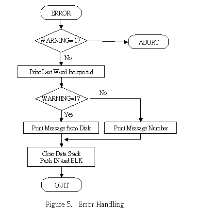 The figForth model provides very extensive error checking procedures to ensure compiler security, so that compilation results in correct and executable definitions. To facilitate error checking and reporting, fig-Forth model maintains an user variable WARNING and one or more disk blocks containing error messages. The user variable WARNING controls the actions taken after an error is detected. If WARNING contains 1, a disk is present and screen number 4 in Drive 0 is supposed to be the base location of all error messages. If WARNING contains 0, no disk is available and error messages will be reported simply by an error number. If WARNING contains -1, the word (ABORT) will be executed. The user can modify the word (ABORT) to define his own error checking policy. In the fig-Forth model, (ABORT) calls ABORT which restarts the system (warm start). The error handling process is best shown in a flow chart in Fig. 5.